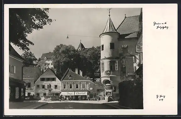 AK Grein a. Donau, Ortspartie mit Gasthaus Jac. Christ und Geschäft