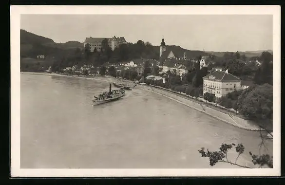 AK Grein a. d. Donau /Strudengau, Uferpartie mit Kirche und Dampfer