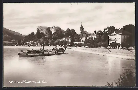 AK Grein a. d. Donau, Uferpartie mit Kirche und Dampfer