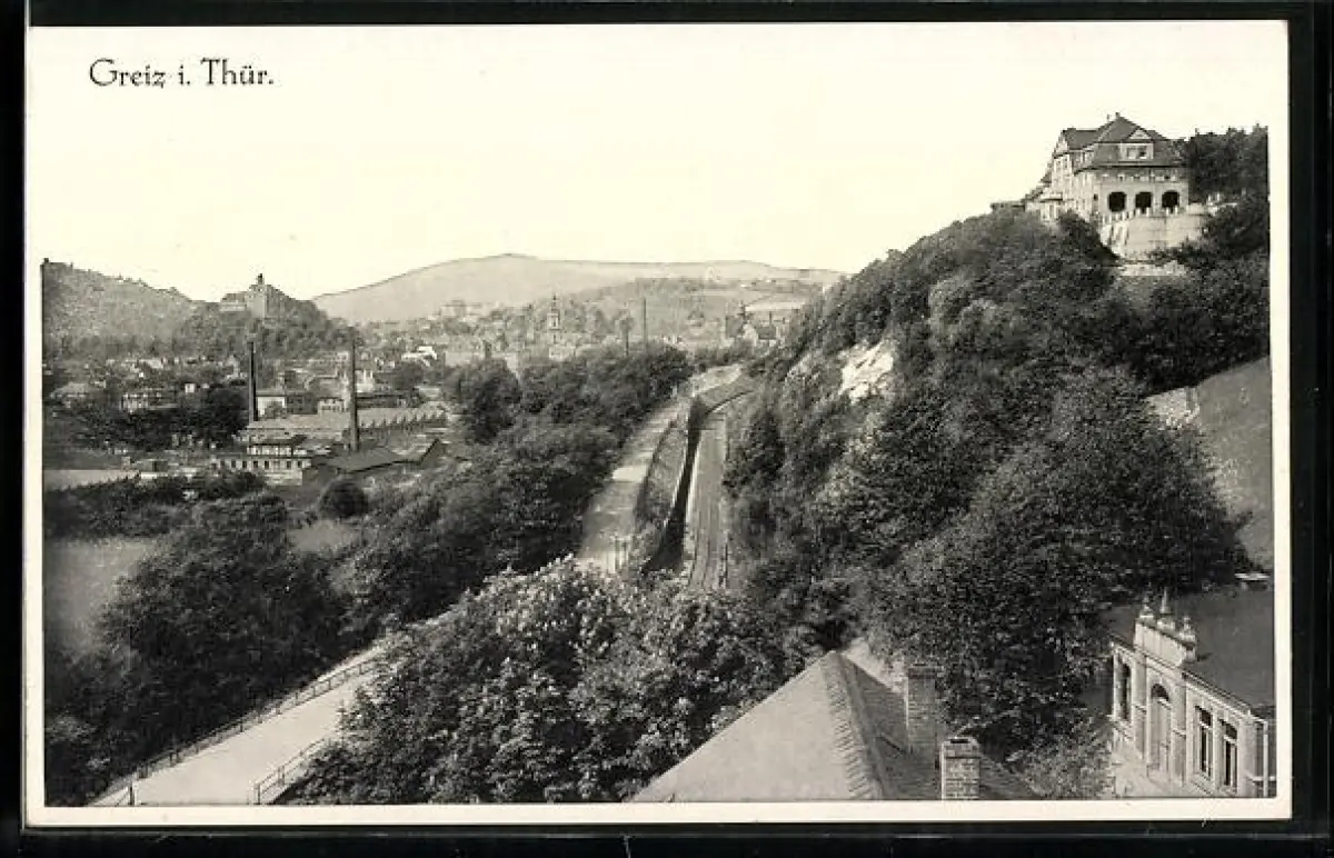 AK Greiz i. Thür., Ortsansicht mit Bahngleisen