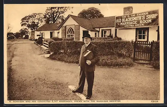 AK Gretna Green, Old Blacksmith Shop, R. Rennison who has conducted 5.147 Marriages, shewn with the Marriage Register