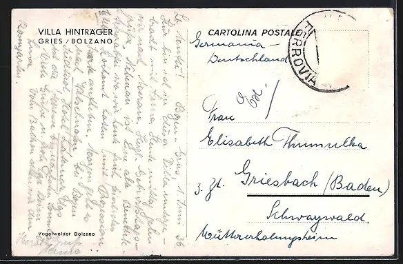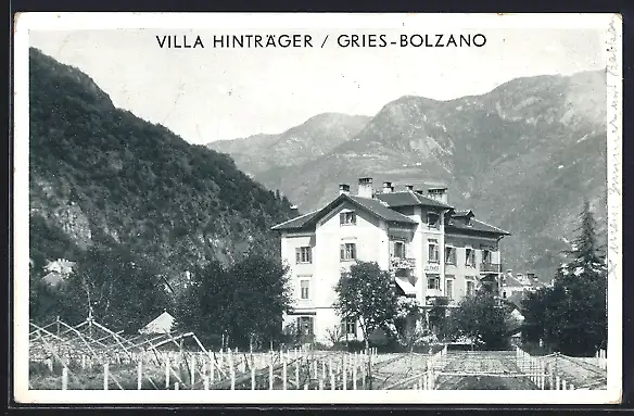 AK Gries-Bolzano, Pension Villa Hinträger mit Bergkulisse