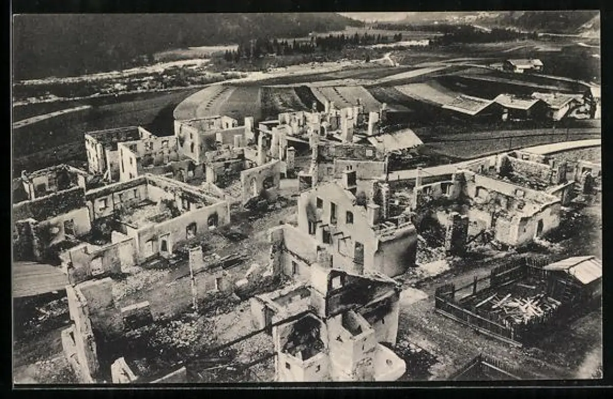 AK Gries, Niedergebrannte Ortspartie aus der Vogelschau