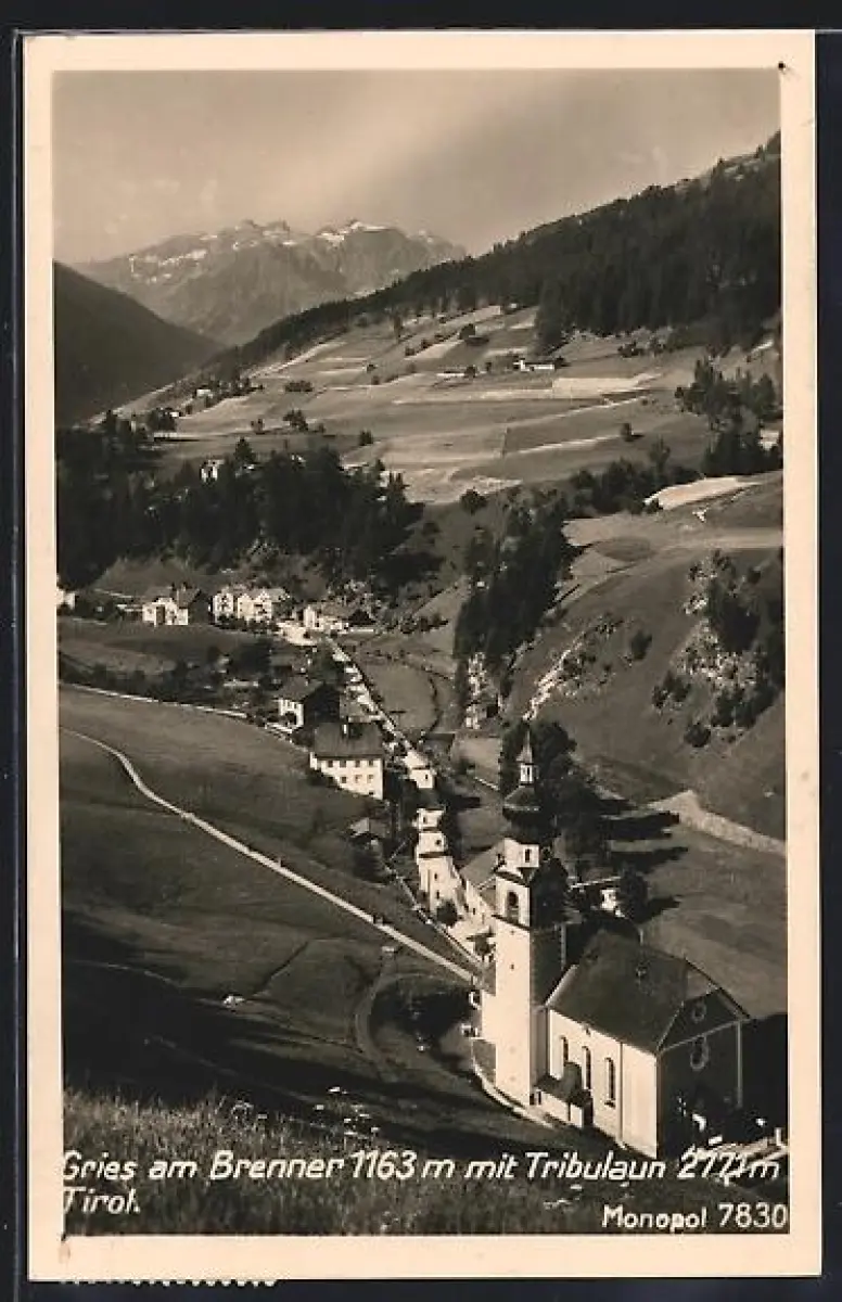 AK Gries am Brenner, Ortsansicht mit Kirche und dem Tribulaun