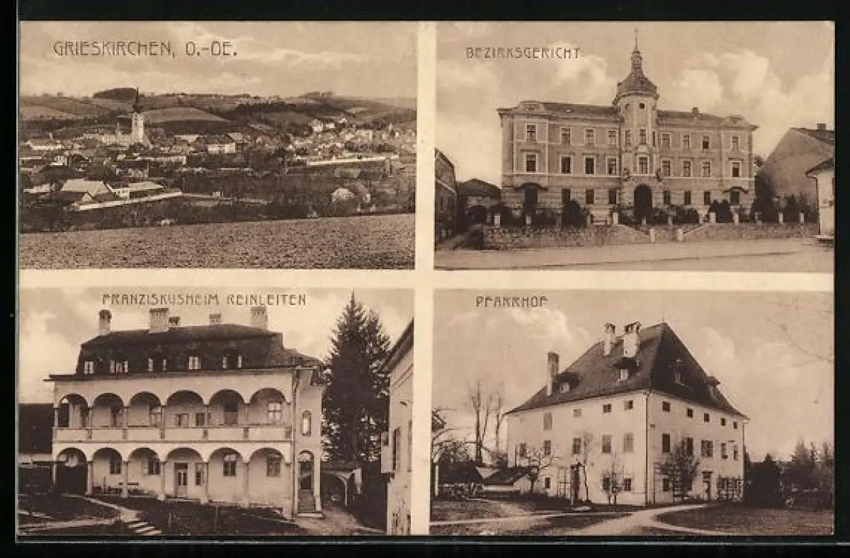 AK Grieskirchen, Ortsansicht, Bezirksgericht, Franziskusheim Reinleiten, Pfarrhof
