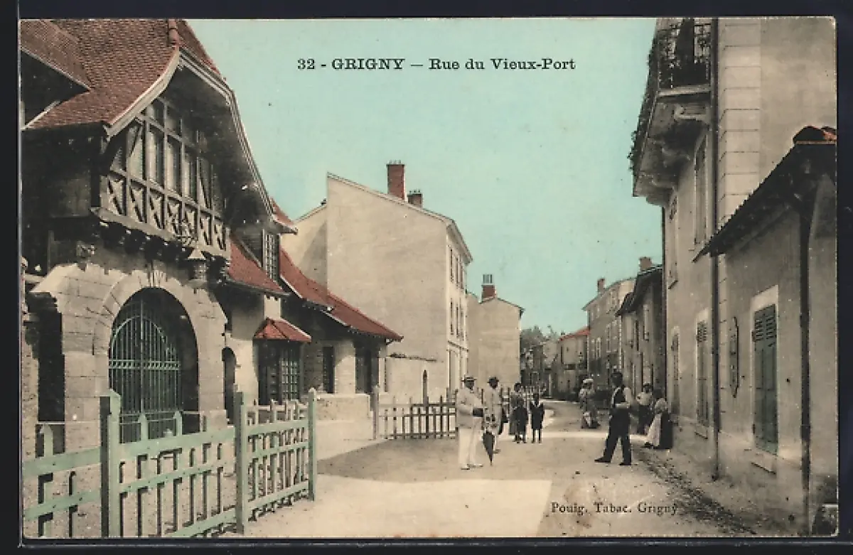 AK Grigny, Rue du Vieux-Port avec des passants et bâtiments traditionnels