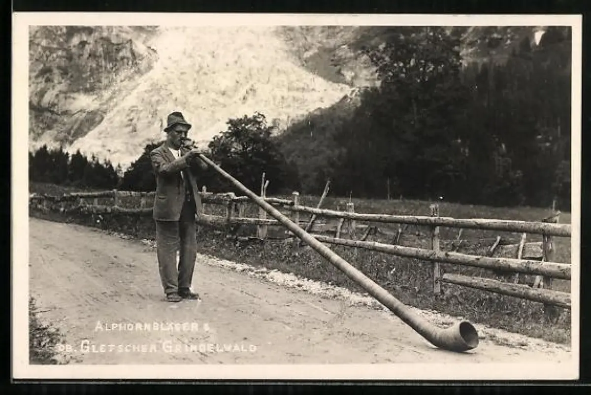 AK Grindelwald, Alphornbläser vor dem Gletscher