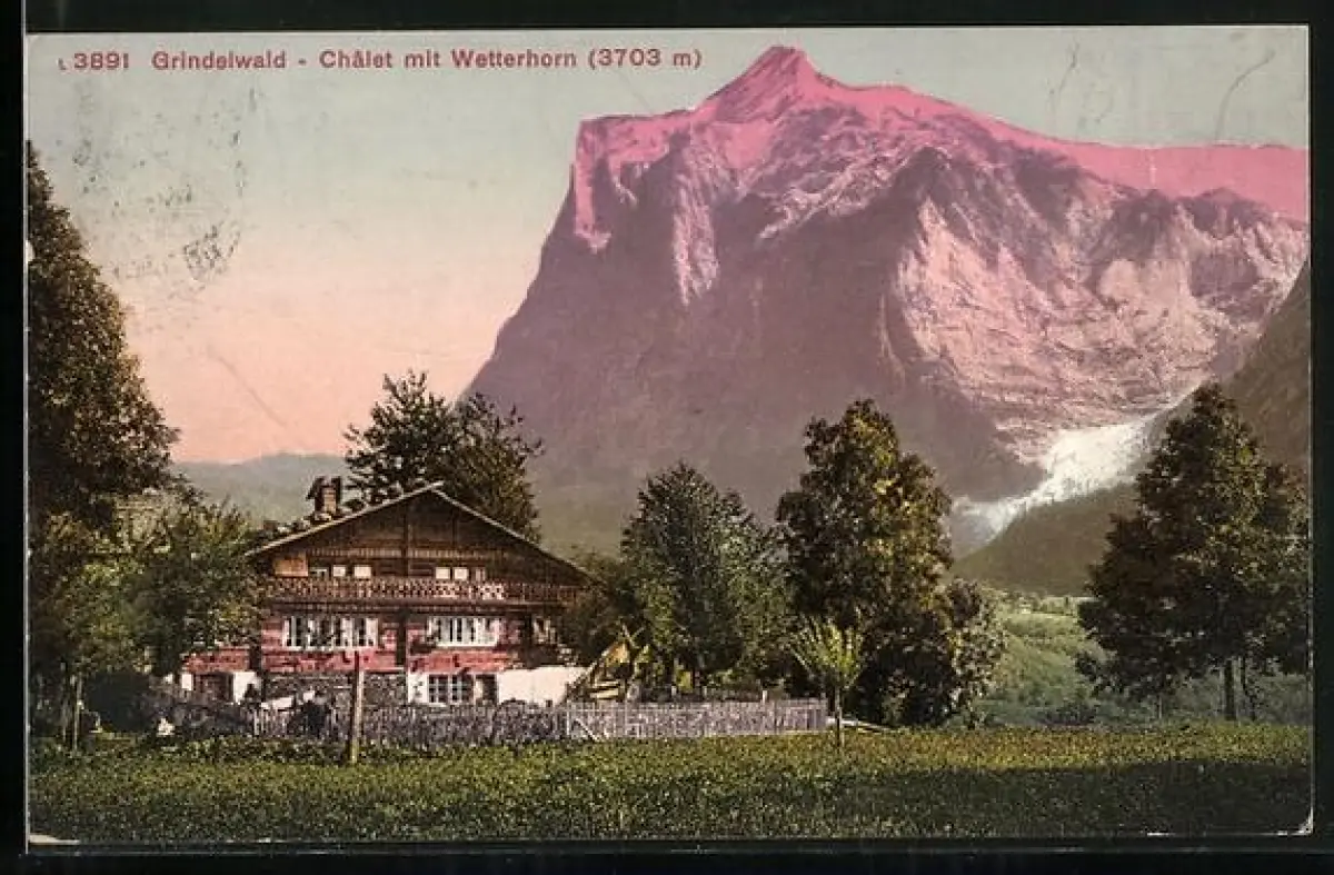 AK Grindelwald, Chalet mit Blick auf das Wetterhorn bei Dämmerung