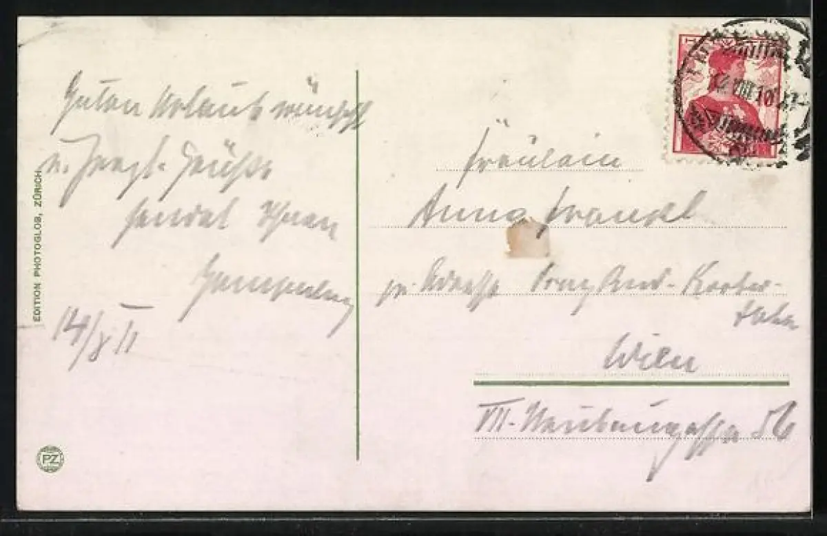 alte Ansichtskarte, gelaufen 1911, rückseitig Klebe- und Papierreste, Stempelspur, minimaler Einriss re. mittig, guter Zustand
