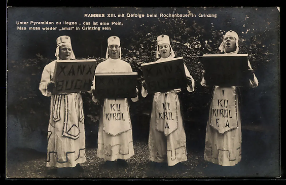 AK Grinzing, Ramses XIII mit Gefolge beim Rockebauer, Fasching