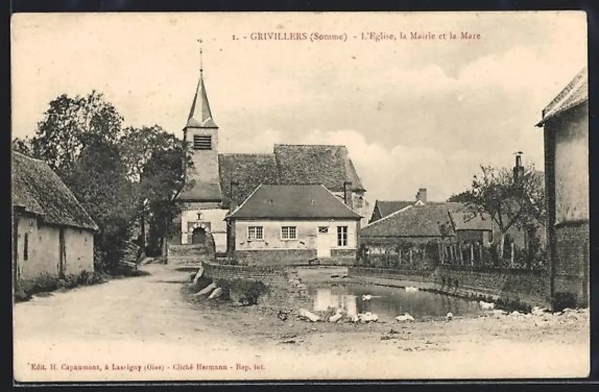 AK Grivillers /Somme, L`Église, la Mairie et la Mare