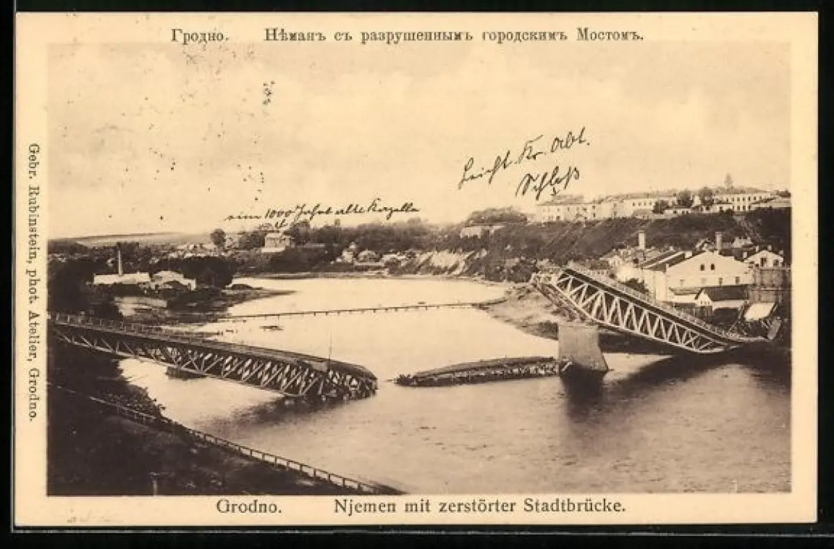 AK Grodno, Njemen mit zerstörter Stadtbrücke