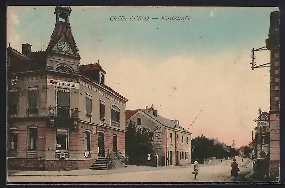 AK Gröba / Elbe, Kirchstrasse mit Gasthaus zum Anker und Gemeindeamt