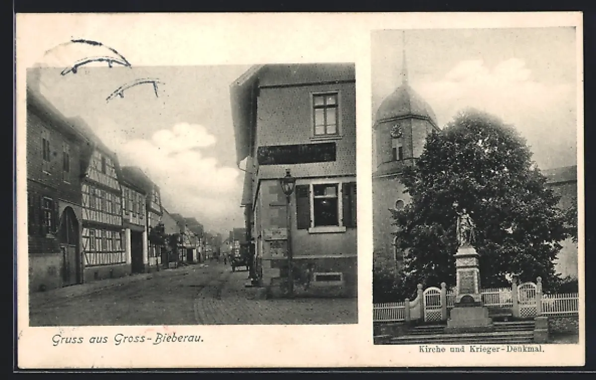 AK Gross-Bieberau, Strassenpartie, Kirche und Krieger-Denkmal