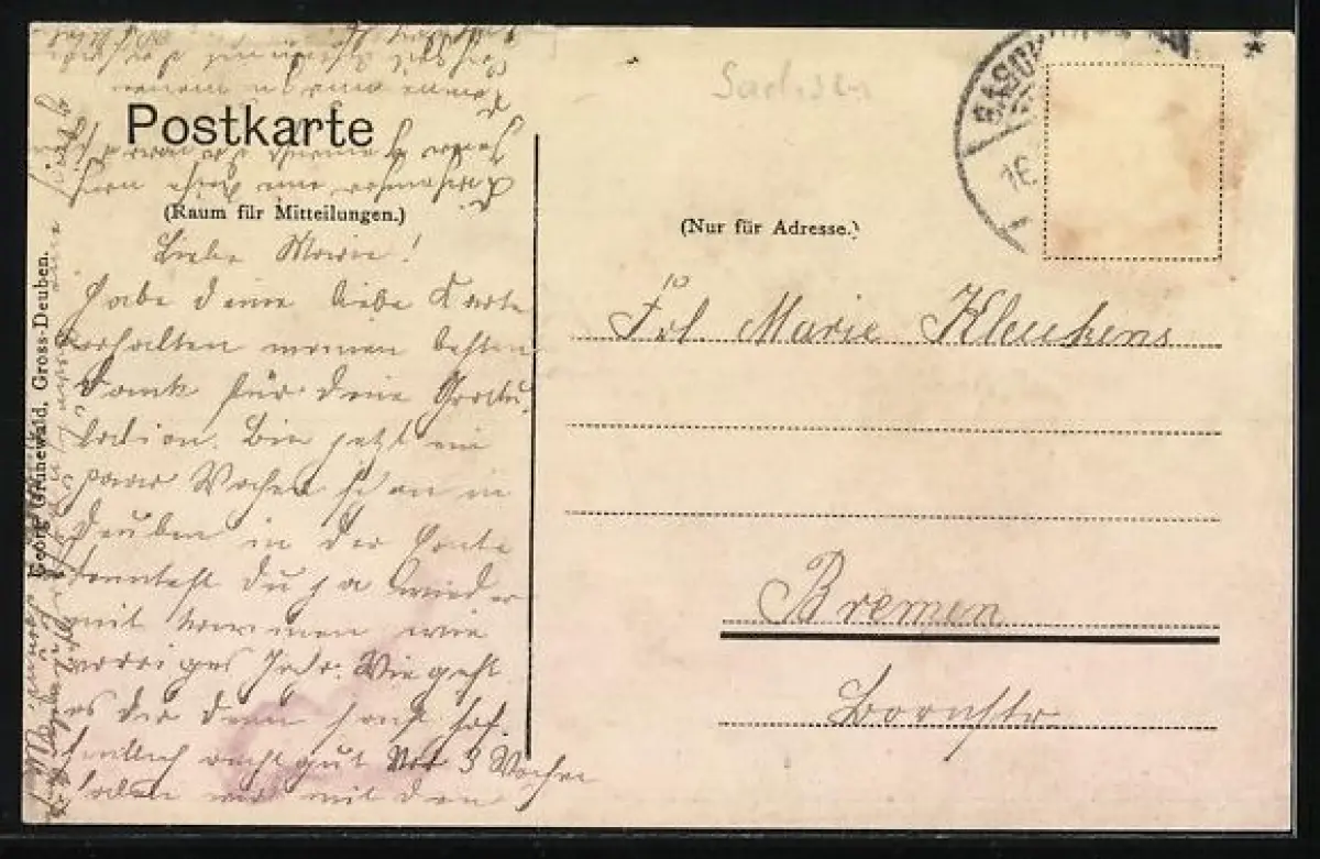 alte Ansichtskarte, gelaufen, Briefmarke entfernt, Abriebspur re. oben, guter Zustand