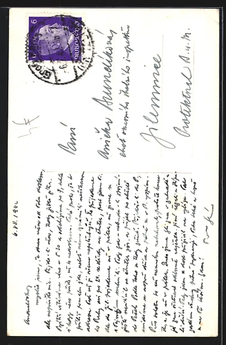 Personenbezogene Daten auf der Rückseite der Karte wurden durch blauen Textmarker unkenntlich gemacht. Die blauen Stellen sind auf die Vorderseite durchgeweicht und wirken sich negativ auf das Postkartenfoto aus