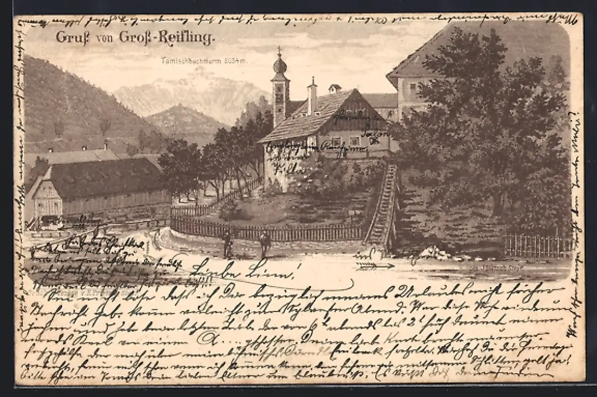 AK Gross-Reifling, Ortspartie mit Blick zum Tamischbachturm