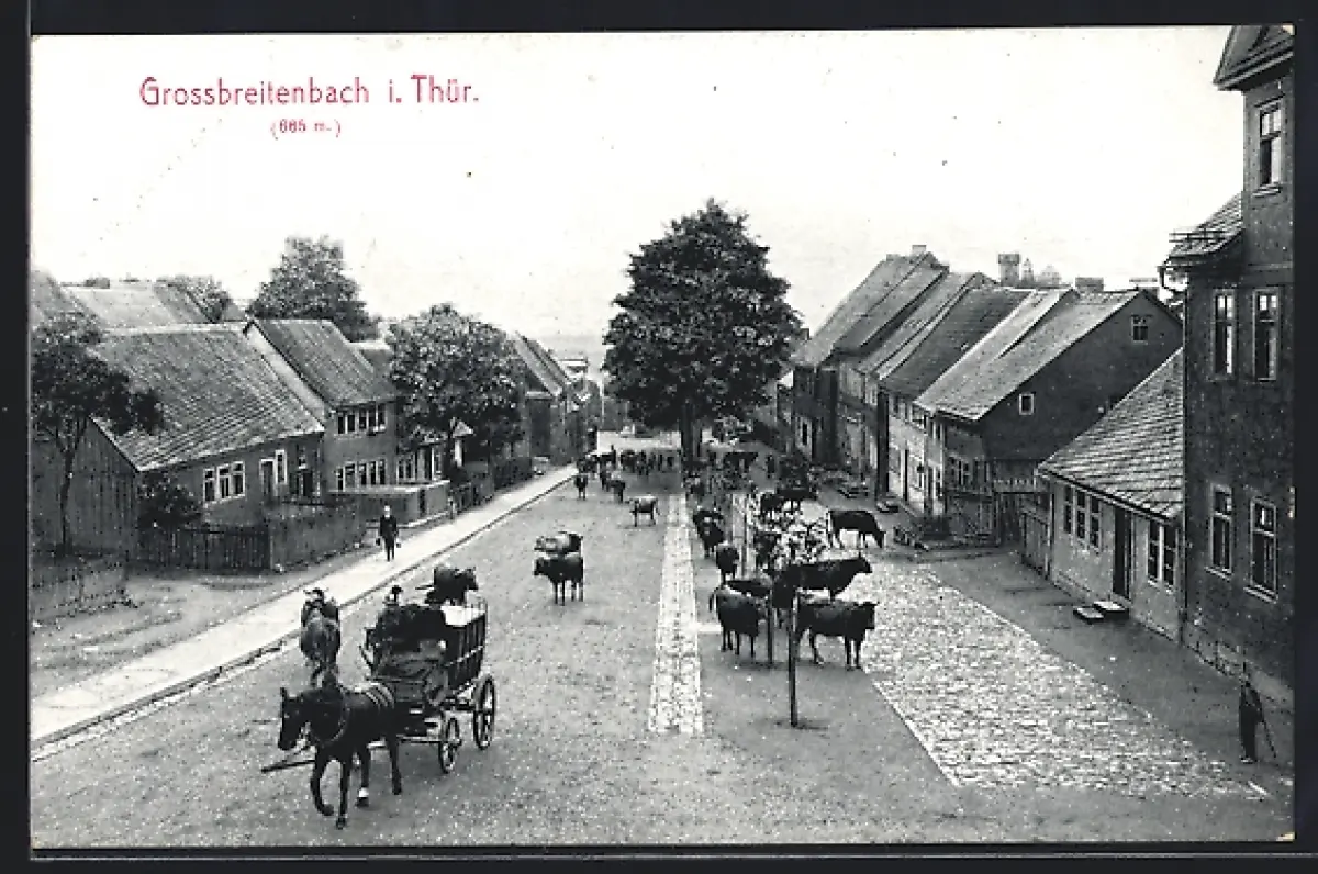 AK Grossbreitenbach i. Thür., Strassenpartie mit Rindern