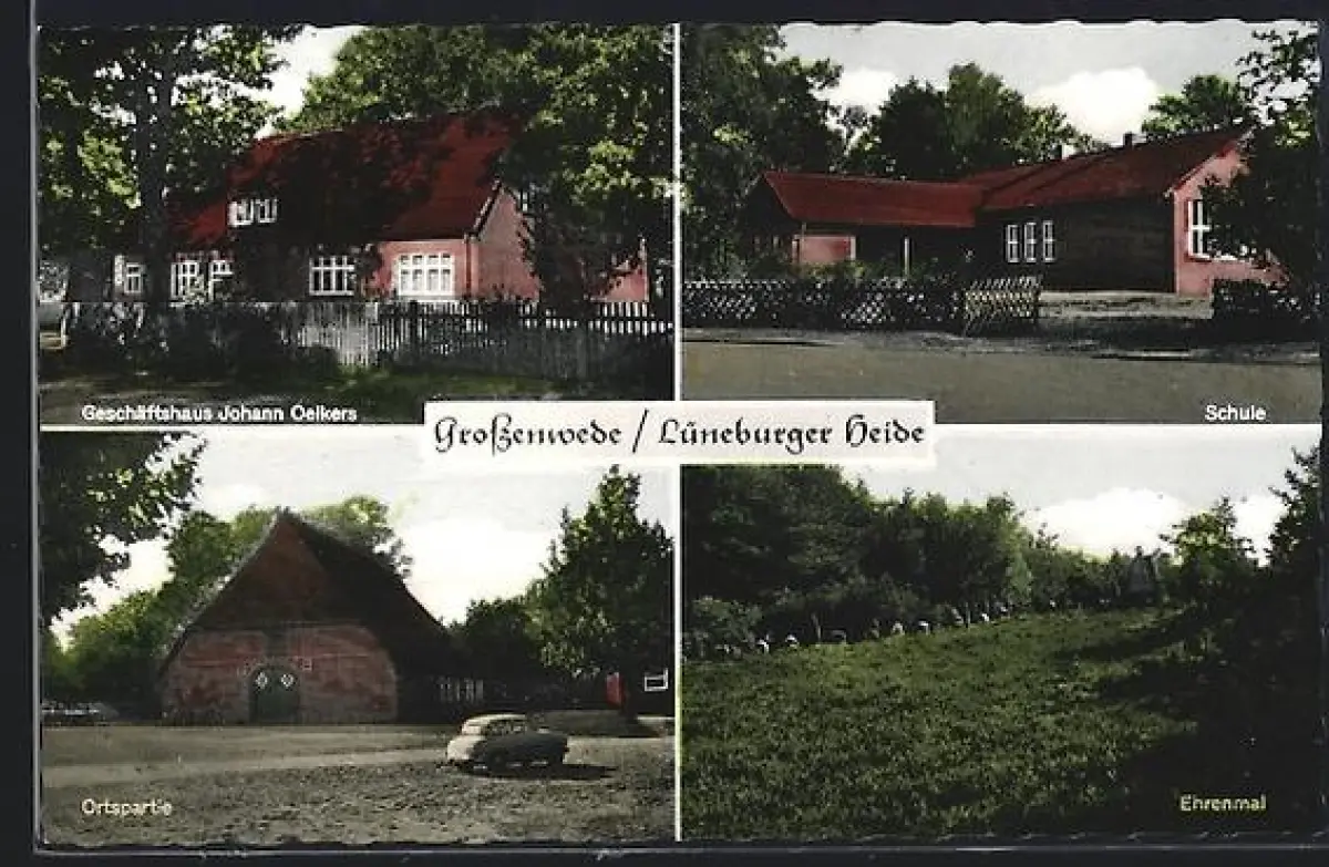 AK Grossenwede /Lüneburger Heide, Geschäftshaus Johann Oelkers, Schule, Ehrenmal