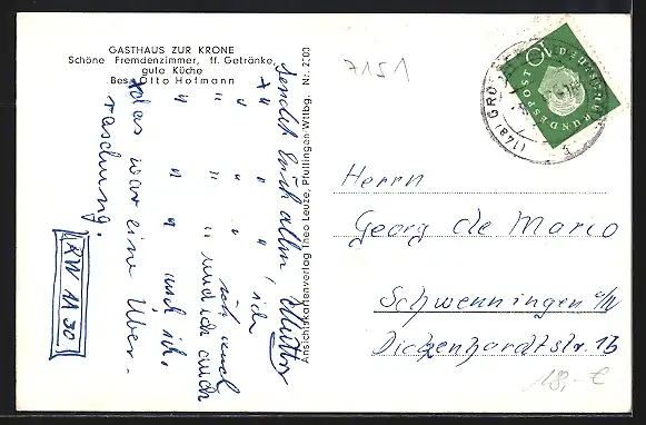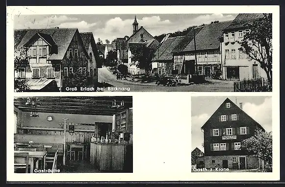 AK Grosserlach / Backnang, Gasthaus zur Krone mit Innenansicht, Inh. Otto Hofmann, Ortsansicht