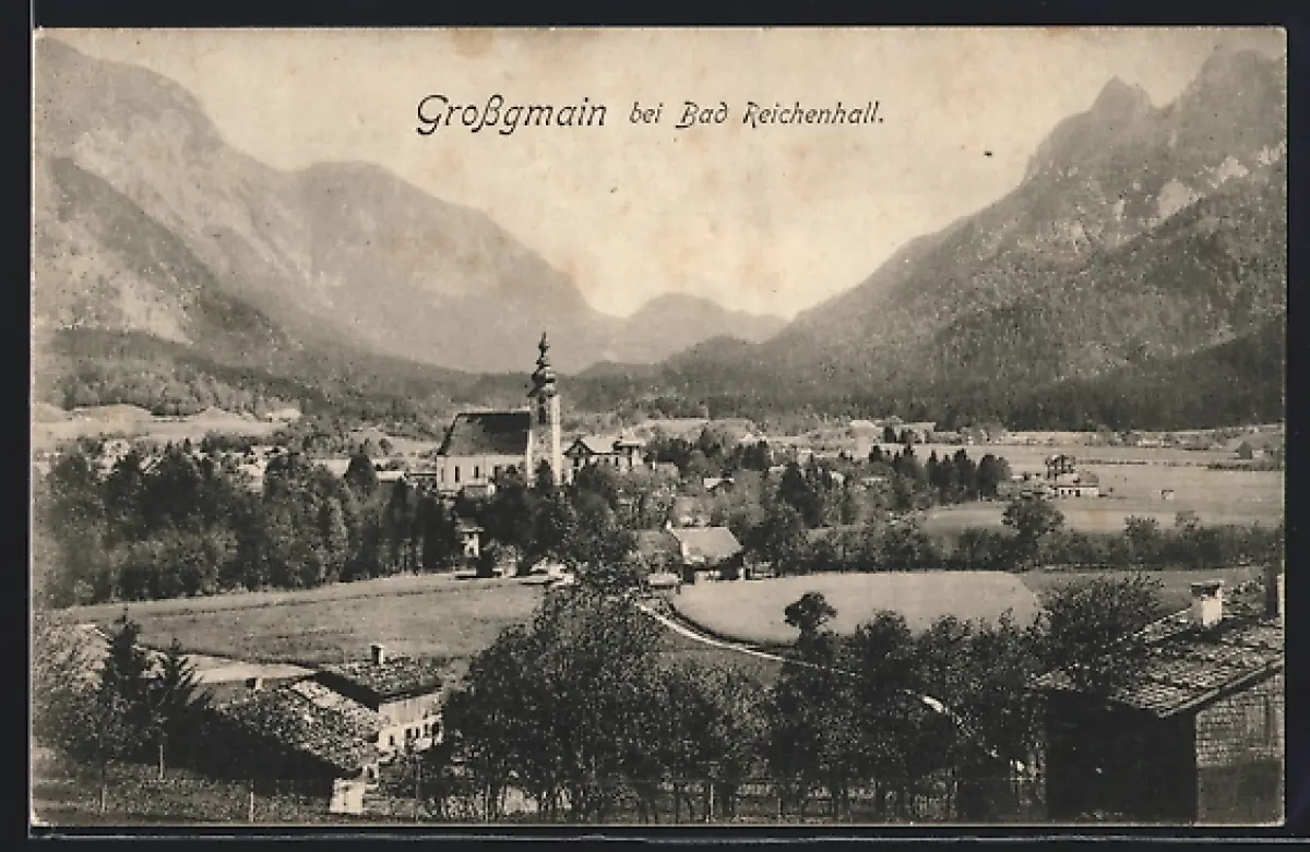 AK Grossgmain, Ortsansicht mit Kirche und Alpenpanorama
