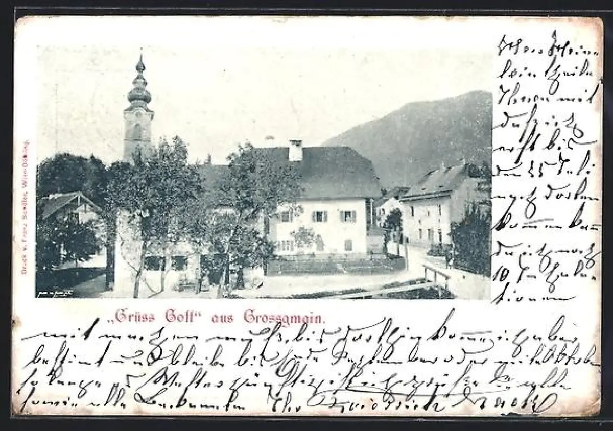 AK Grossgmain, Ortspartie mit Platz und Kirchturm