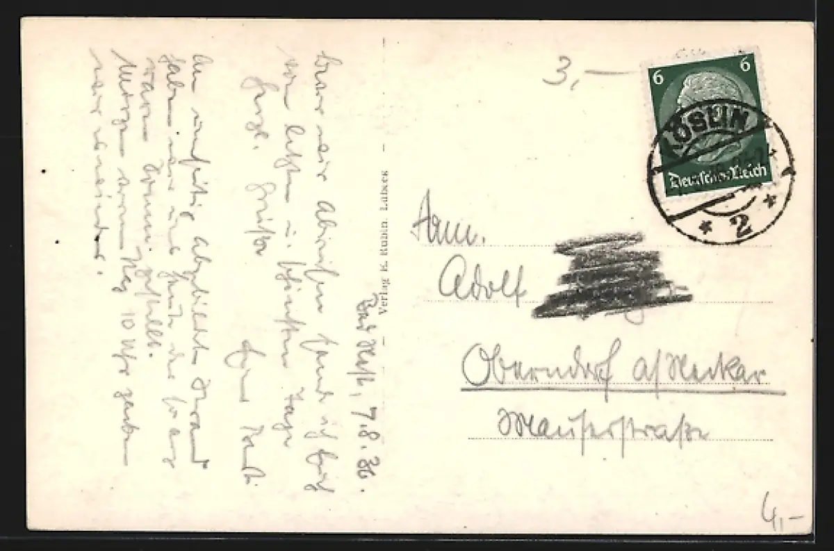 Personenbezogene Daten auf der Rückseite der Karte wurden durch blauen Textmarker unkenntlich gemacht. Die blauen Stellen sind auf die Vorderseite durchgeweicht und wirken sich negativ auf das Postkartenfoto aus