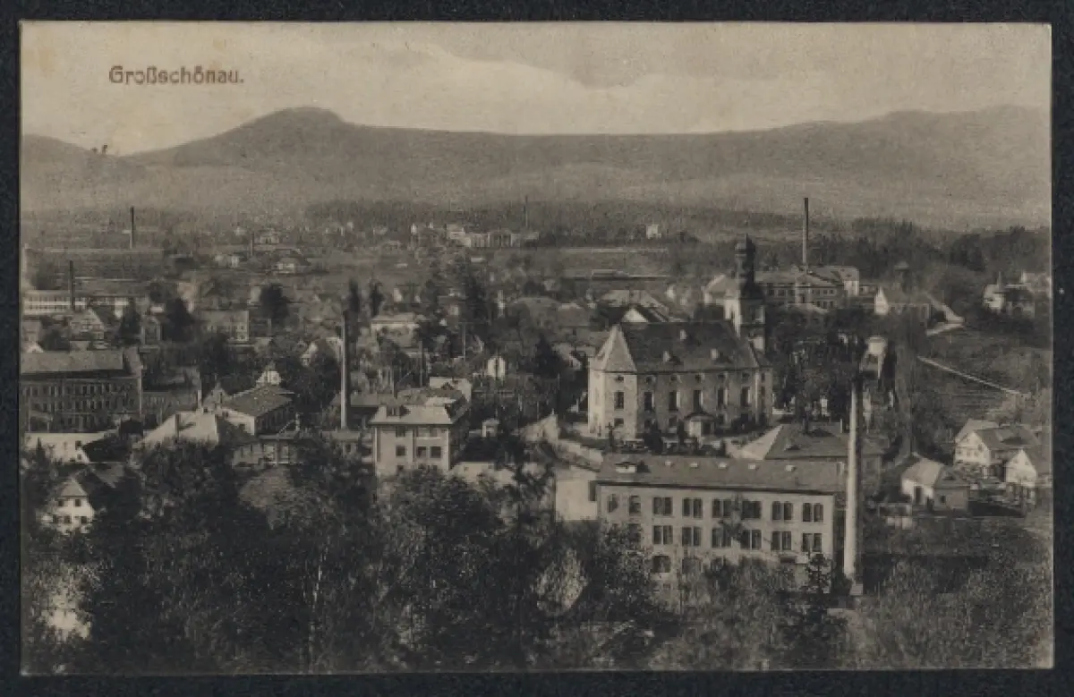AK Grossschönau / Sachsen, Ortsansicht mit Fabrikgebäuden und Panorama