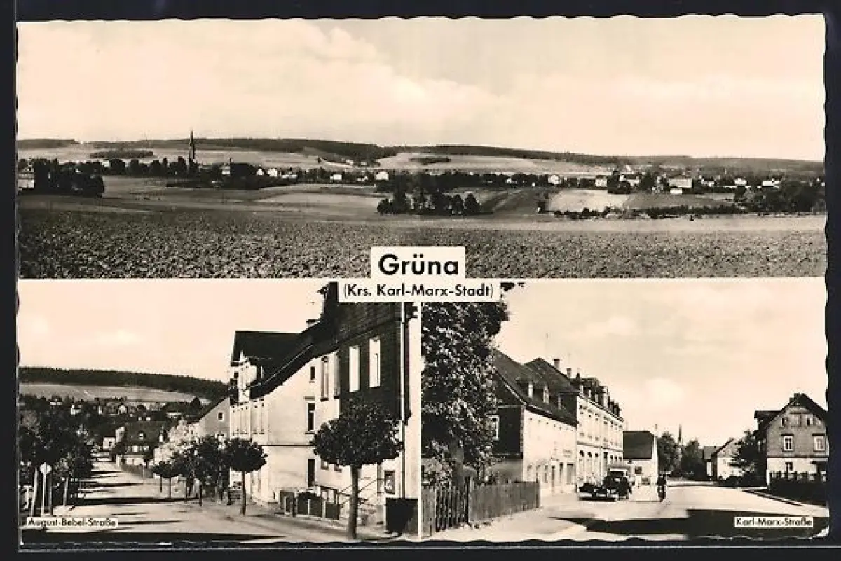 AK Grüna / Chemnitz, Panorama, August-Bebel-Strasse, Karl-Marx-Strasse