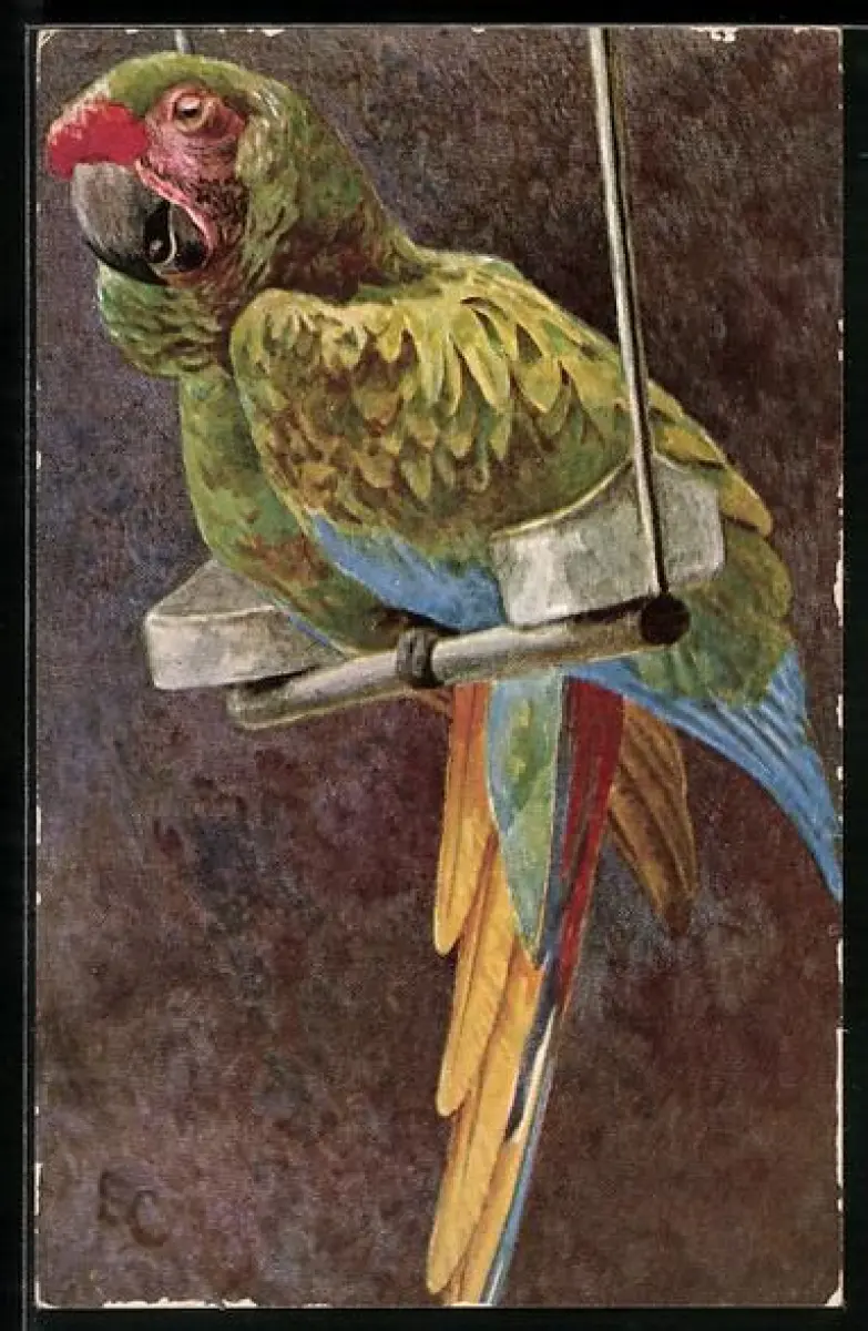 AK Grüner Papagei sitzt auf einer Vogelschaukel