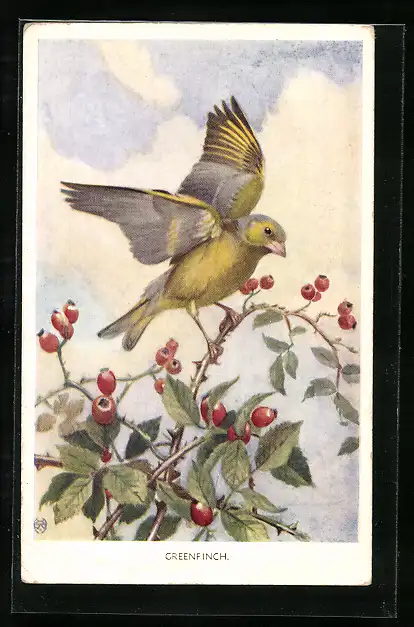 AK Grünfink auf Hagebuttenstrauch