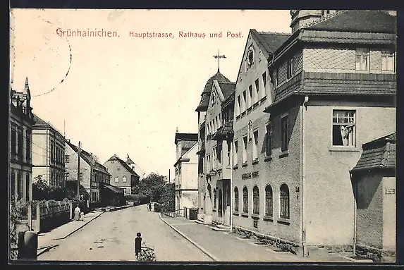 AK Grünhainichen, Hauptstrasse mit Rathaus und Post