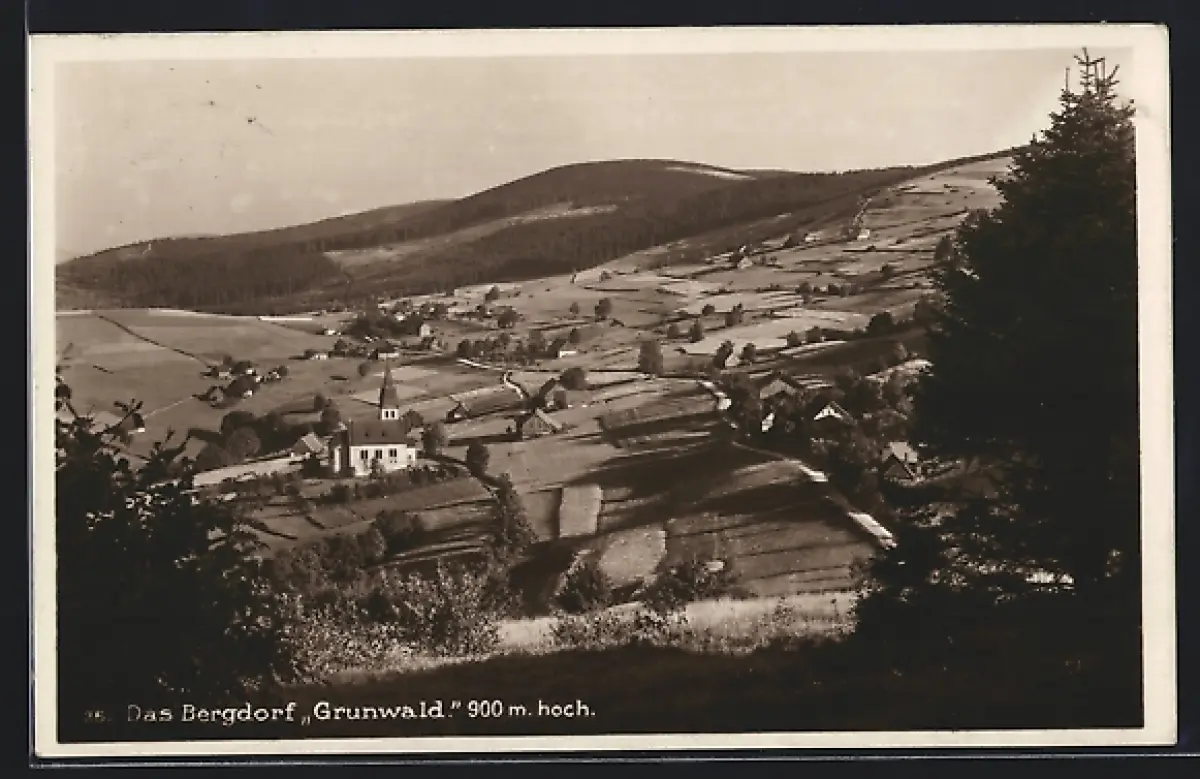 AK Grunwald, Ortsansicht mit Kirche vom Berghang aus