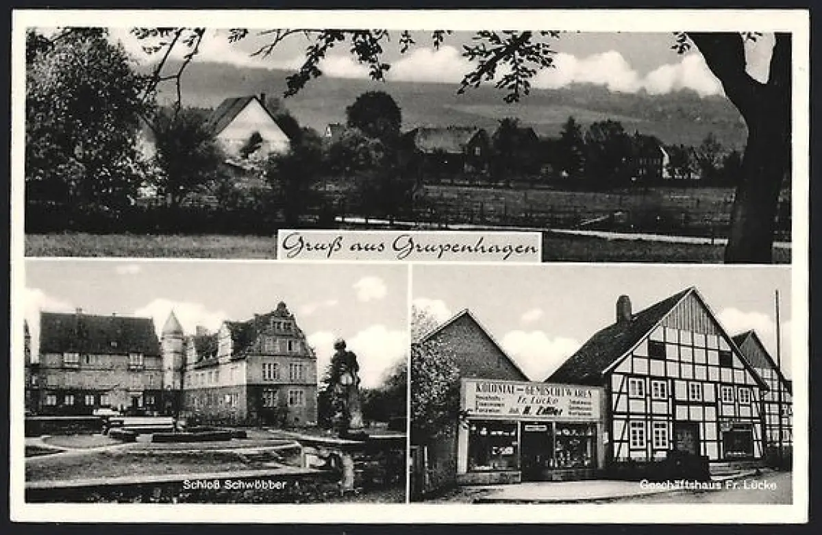 AK Grupenhagen, Geschäftshaus Fr. Lücke, Schloss Schwöbber, Ortspartie