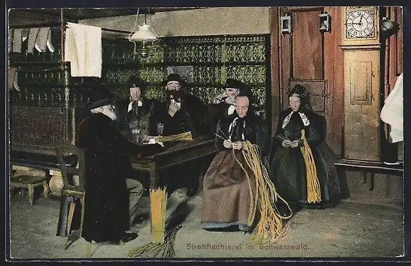AK Gruppe in Schwarzälder Tracht, Frauen flechten Stroh