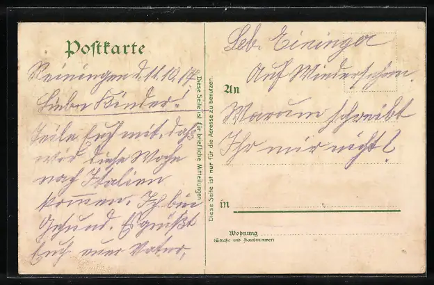 Personenbezogene Daten auf der Rückseite der Karte wurden durch blauen Textmarker unkenntlich gemacht. Die blauen Stellen sind auf die Vorderseite durchgeweicht und wirken sich negativ auf das Postkartenfoto aus