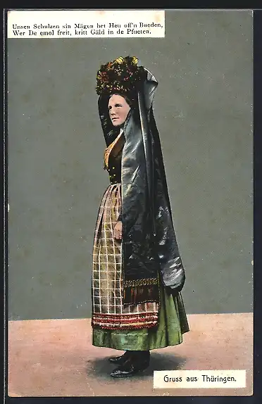 AK Gruss aus Thüringen, Frau in thüringischer Tracht