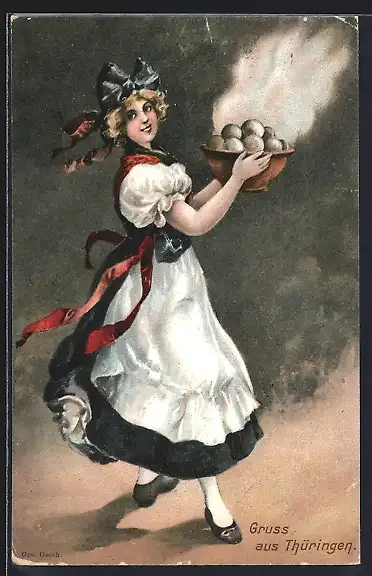 AK Gruss aus Thüringen, Frau in thüringischer Tracht mit Knödeln
