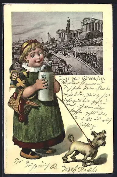 AK Gruss vom Oktoberfest, Mädchen mit Bierkrug und Münchner Kindl, Ansicht mit Bavaria