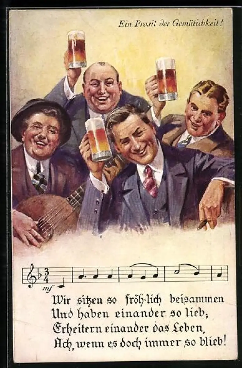 AK Gruss vom Oktoberfest, Männer mit Gitarre trinken Bier, Notenzeile in F-Dur