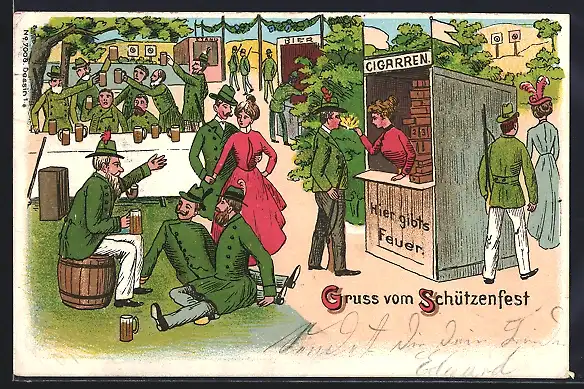 AK Gruss vom Schützenfest, Zigarrenstand und Biertisch