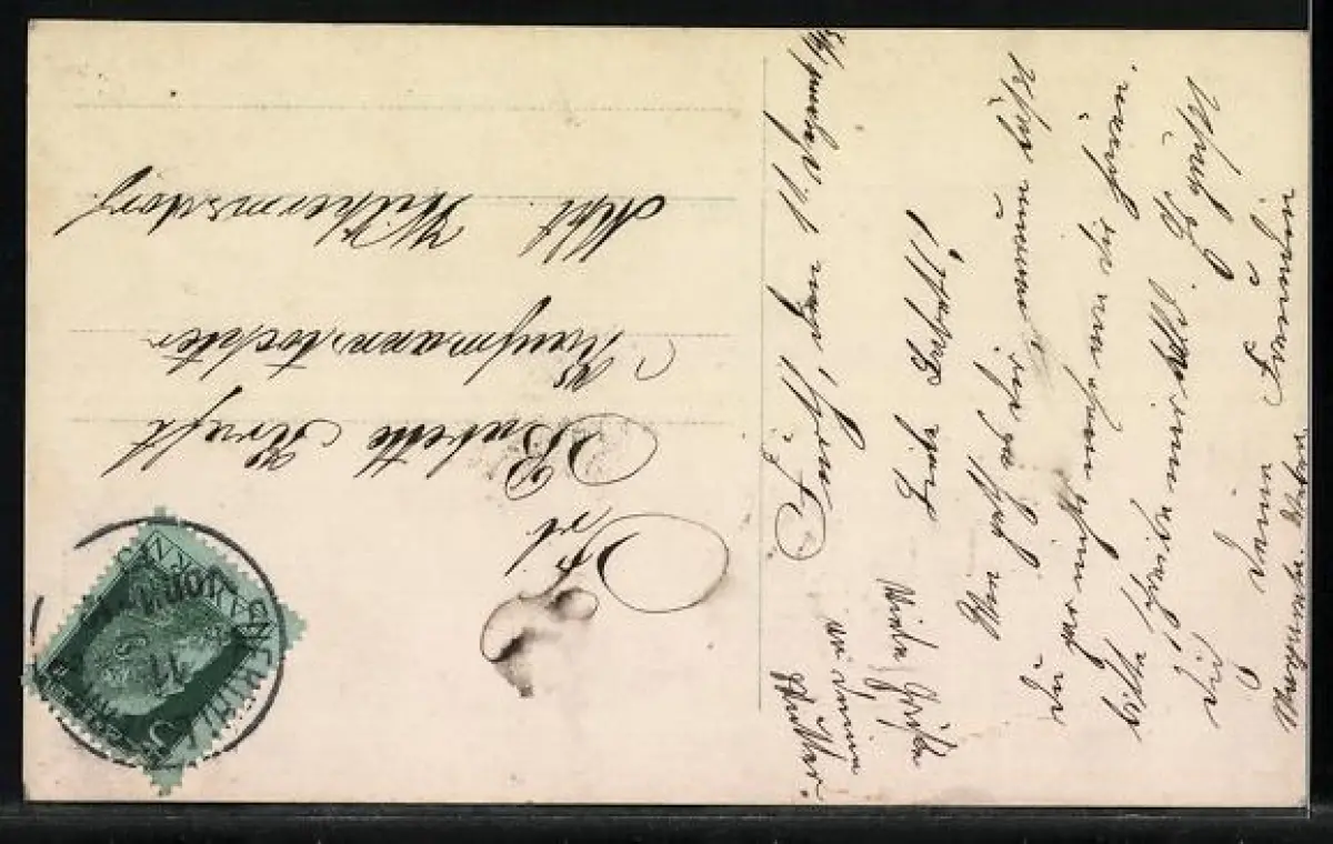 Personenbezogene Daten auf der Rückseite der Karte wurden durch blauen Textmarker unkenntlich gemacht. Die blauen Stellen sind auf die Vorderseite durchgeweicht und wirken sich negativ auf das Postkartenfoto aus