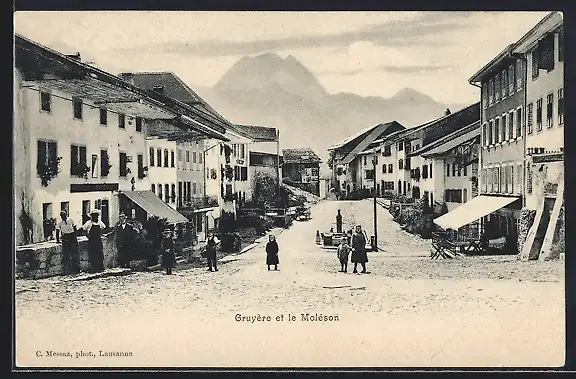 AK Gruyères, Strassenpartie mit Blick zum Moléson