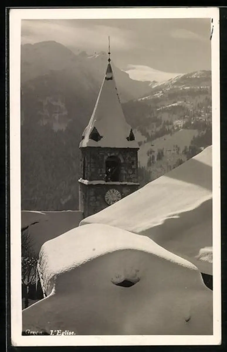 AK Gryon, L`Église sous la neige avec vue sur les montagnes alpines enneigées