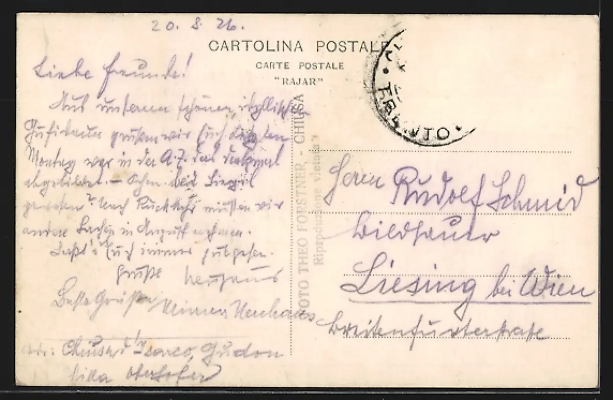 Personenbezogene Daten auf der Rückseite der Karte wurden durch blauen Textmarker unkenntlich gemacht. Die blauen Stellen sind auf die Vorderseite durchgeweicht und wirken sich negativ auf das Postkartenfoto aus