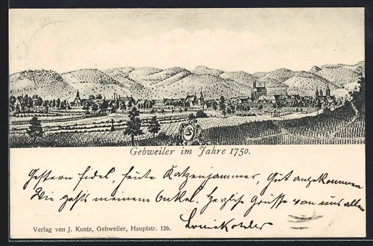 AK Guebwiller, Vue de la ville en 1750 avec paysages environnants