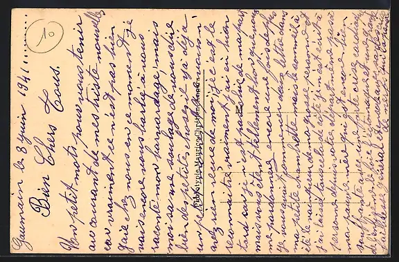 Personenbezogene Daten auf der Rückseite der Karte wurden durch blauen Textmarker unkenntlich gemacht. Die blauen Stellen sind auf die Vorderseite durchgeweicht und wirken sich negativ auf das Postkartenfoto aus