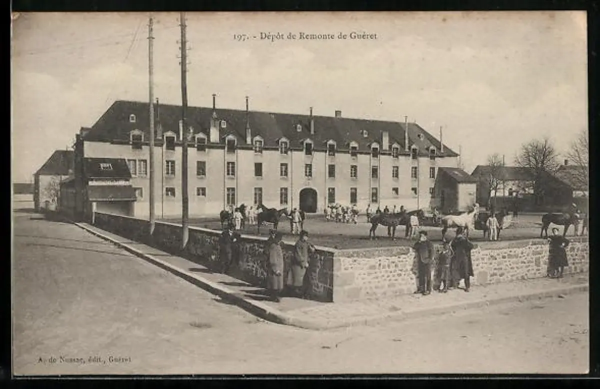 AK Guéret, Dépôt de Remonte de Guéret avec chevaux et soldats devant le bâtiment