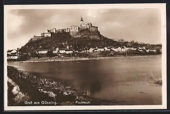 AK Güssing, blick vom Fischteichufer auf den Ort