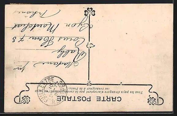 Personenbezogene Daten auf der Rückseite der Karte wurden durch blauen Textmarker unkenntlich gemacht. Die blauen Stellen sind auf die Vorderseite durchgeweicht und wirken sich negativ auf das Postkartenfoto aus
